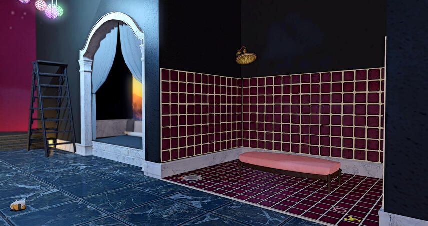 An extravagant throne room complete with viewing gallery and plenty of space for your loyal subjects to kneel in supplication. Should the queen allow you to proceed beyond the throne, you'll find a custom cage bed and other entertainment amenities.