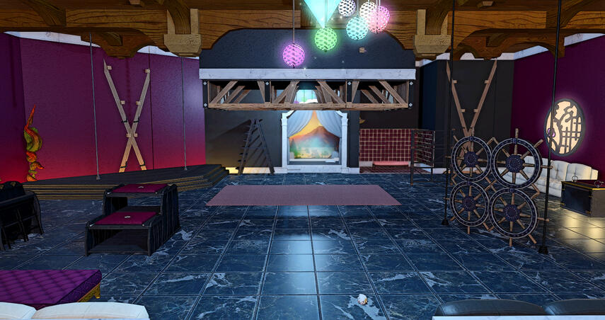 Enter the basement and you'll find yourselves in our unique, custom-designed play space! Our amenities include a wooden horse, spanking bench, two four-point restraint tables, an area with hardpoints and soft mats for suspension, a stage with a St. Reymanaud's cross, and adjustable-height stocks to accommodate all from the most petite Au Ra to the tallest Roegadyn! We're especially proud of our bondage web prism, and of course our local friendly tentacle monster Audrey, who you won't find at any other dungeon in Eorzea! To the rear of the space, you'll also find a bed for the more vanilla exhibitionists as well as a small wetroom area for messy play and glory hole for anonymous encounters. The dungeon provides toys such as rope, paddles, floggers, and so on for use by the curious - don't worry, everything has been enchanted to remain safe and sterile!