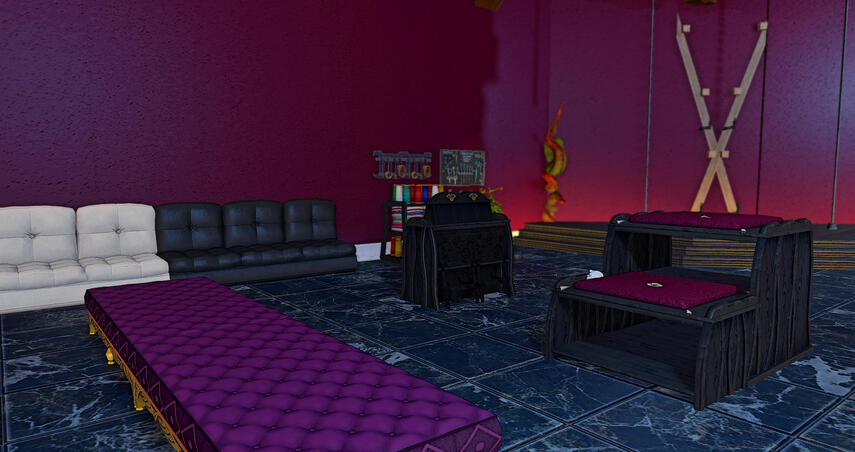 A space for collaring ceremonies, blasphemy kink, hierophilia, or just plain old human sacrifices on the plinth (like all our custom furniture, it is doze-able for console users!).